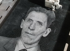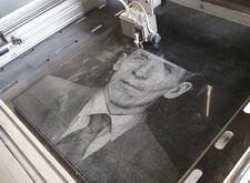 Исходя из пожеланий клиента мы выбрали оформление, сразу же после чего принялись за выполнение поставленной задачи. Первым этапом работы стала гравировка чёрно-белого изображения с помощью станка на прямоугольную плиту из полированного гранита.