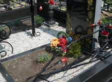Состояние могилы после небольшого цикла работ. Покрашена лавка и ограда, обновлены розочки на ограде, помыты памятники и гранитный цоколь, убраны цветники и сорняки, почищена мраморная крошка. На могилу возложили свежие цветы.